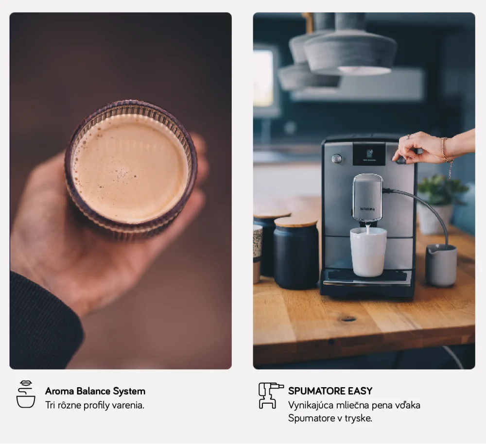 Pokud máte rádi cappuccino: S EASY SPUMATORE můžete na NICR690 připravit úžasnou mléčnou pěnu, a to ze stejného výtoku, ze kterého teče káva. Vaše NIVONA vám poradí, co máte dělat. A pomocí několika tlačítek získáte na tomto plně automatickém kávovaru mléčnou pěnu, kterou můžete použít na latte či cappuccino.