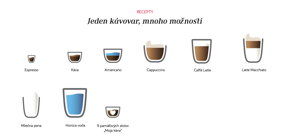 | KOMFORT | „Moja káva“ sa dá uložiť 9 receptov Živé programovanie Výrobné nastavenie receptov je možné zmeniť Dvojfarebné osvetlenie šálok OneTouch-SPUMATORE DUOplus (pre cappuccino a spol.) Funkcia 2 šálok na cappuccino atď. Funkcia 2 šálok na espresso/kávu Priehradka na porciu mletej kávy Funkcia horúcej vody na čaj (3 úrovne) Rýchly profil |