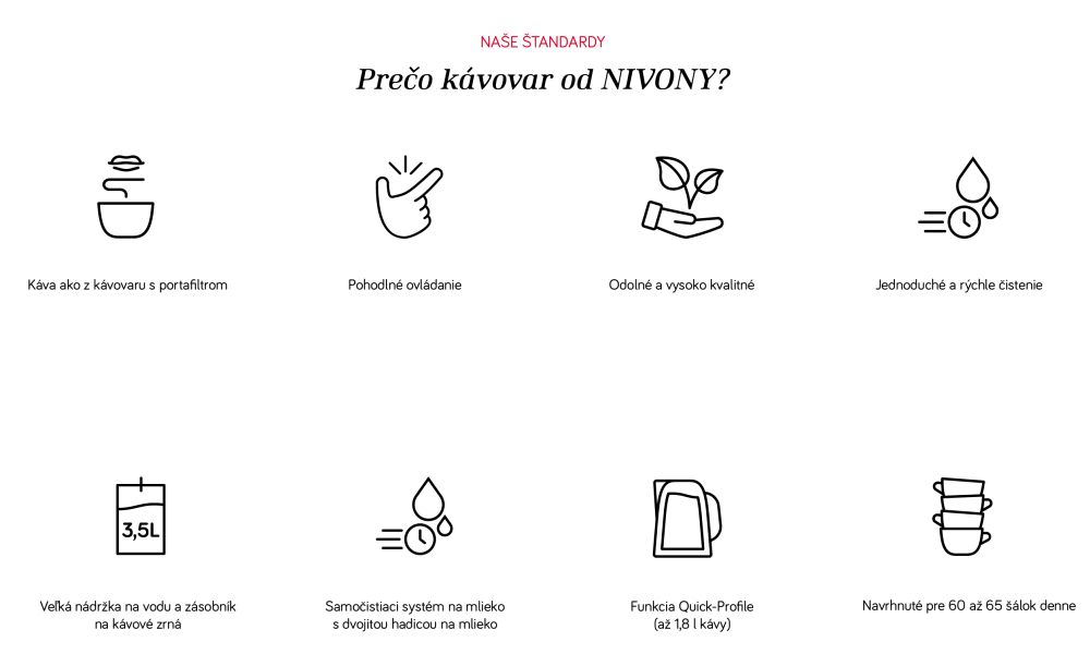 Ak oceníte vynikajúcu kávu a hľadáte kávovar, stojíte pred mnohými značkami a dodávateľmi. Každý, kto prišiel do kontaktu s kávovarmi NIVONA, určite nájde ten správny stroj pre svoje potreby. Zariadenia, ktorých možnosti, funkcie či špecifiká možno len ťažko prehliadnuť. NIVONA je vysoko ambiciózna značka, ktorá sa predáva iba prostredníctvom špecializovaných predajcov. Každý, kto vlastní NIVONU, zostáva presvedčený zákazník.