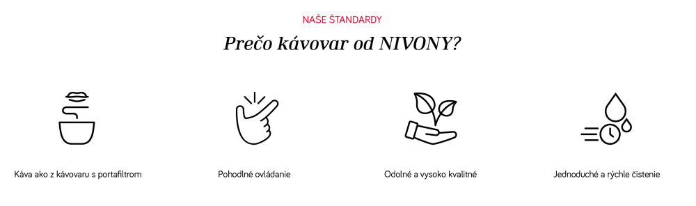 Ak oceníte vynikajúcu kávu a hľadáte kávovar, stojíte pred mnohými značkami a dodávateľmi. Každý, kto prišiel do kontaktu s kávovarmi NIVONA, určite nájde ten správny stroj pre svoje potreby. Zariadenia, ktorých možnosti, funkcie či špecifiká možno len ťažko prehliadnuť. NIVONA je vysoko ambiciózna značka, ktorá sa predáva iba prostredníctvom špecializovaných predajcov. Každý, kto vlastní NIVONU, zostáva presvedčený zákazník.